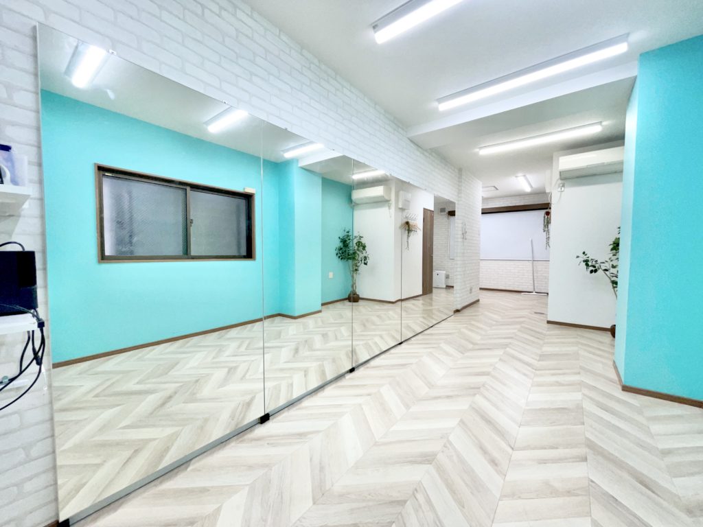約15平米、横4.5mの鏡有り。